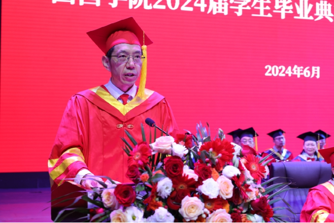 白洁代表学校向圆满完成学业并顺利毕业的5324名同学致以热烈的祝贺!向悉心培养学子的老师们致以诚挚的谢意,向辛勤抚育学生的父母表示崇高的敬意。她指出,四年里,同学们汲取了知识的甘泉,锤炼了坚韧的意志,培养了独立思考、发现问题、分析问题和解决问题的能力;亲历了众志成城、万众一心的抗疫战斗;亲身参与了我们党领导的脱贫攻坚奔小康的伟大壮举;以胸怀家国、昂扬向上、无私奉献的精神风貌,为自己的青春留下最美的注脚,也在学校的荣誉殿堂里留下精美华章;四年来,学校各方面也都取得了长足发展。她以《逐光而行,鹏程万里》为题,寄语学子们要追寻真理之光,笃定前行。要带着红色基因和红色血脉,毕生追寻真理之光,笃定走在人生路上。要点亮智慧之光,创新担当。志存高远、脚踏实地,不畏艰难险阻,勇担时代使命,把个人的理想追求融入党和国家事业之中,点亮人生智慧之光。要心中永驻阳光,热爱生活。奔赴热爱,发展成为积极向上、阳光开朗,富有创造活力、孕育美好未来的高素质应用型人才。