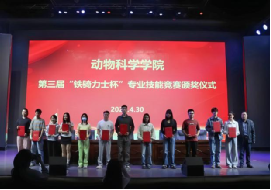 学院领导先后上台为优秀个人和团队颁奖。孙德刚颁发了团体和单人奖;黄志秋颁发了生态畜牧场规划设计,饲料原料快速鉴定与掺假识别一一掺假鱼粉的鉴定,鸡的精液采集、品质检测及人工授精,猪的外形评分、活体背膘厚与眼肌面积测定的一二三等奖;郝桂英颁发了兔胃切开术,家禽解剖,小白鼠解剖和病原接种以及团体一二三等奖;黄增文颁发了水产养殖学专业水族缸造景设置一、二等奖。