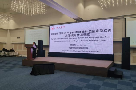 开幕式结束后,郝桂英在主会场做“四川攀西地区牛羊体表硬蜱种类鉴定及立克次体携带情况调查”学术报告。她从硬蜱的介绍、利用形态学和分子生物学等方法对凉山州和攀枝花市的硬蜱进行鉴定,并详细阐述了蜱携带立克次体情况。