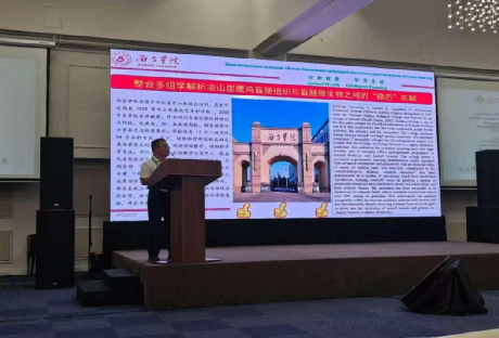 黄增文做“整合多组学解析凉山崖鹰鸡盲肠组织与盲肠微生物之间的稳态机制”的学术报告。他从研究背景、研究材料、研究思路、研究结果等方面详细介绍了其科研成果,通过整合转录组、宏基因组学分析发现凉山岩鹰鸡1—28日龄生长阶段盲肠组织变化基因和盲肠内变化微生物共同富集于52条pathway,其中“ko01100”Pathway的条目数最多,分别涉及基因8个、微生物13种;对凉山岩鹰鸡1—28日龄生长阶段显著变化的10个盲肠组织基因及最终富集于共同pathway的13种盲肠微生物进行互作分析,发现这些基因与肠道微生物之间存在显著的互作关系,一定程度上诠释了凉山崖鹰鸡盲肠组织与盲肠微生物之间的“稳态”机制。