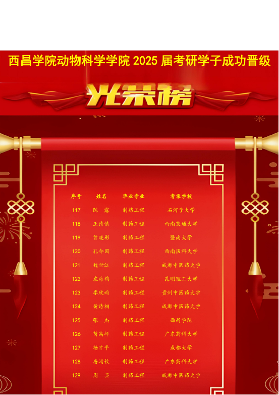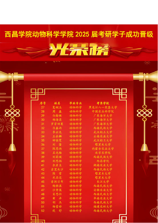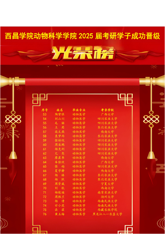 动科学子们以坚韧不拔的意志和严谨求实的态度,夜以继日地奋斗在备考一线,他们不仅在专业知识上精益求精,更在心理素质、时间管理等多方面实现了自我提升,展现了勤奋好学、勇于攀登的精神风貌。本届考研成绩斐然,再创动科学院考研新高。这些辉煌的成就,不仅是对学生们个人努力的充分认可,更是对西昌学院教学质量、育人环境以及师生共同奋斗成果的有力体现。