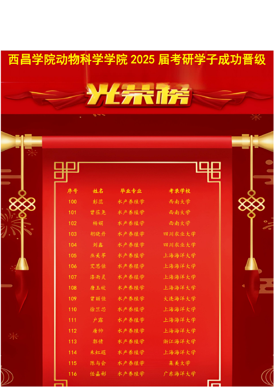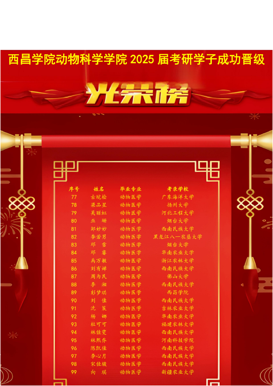 西昌学院动物科学学院2025届毕业生考研捷报频传:截至目前,有136名学子成功晋级(动物科学专业54人、动物医学专业49人、水产养殖学专业17人、制药工程专业16人)。其中,78人被中国农业大学、西北农林科技大学等双一流知名高校录取,谱写了“二本逆袭”的崭新篇章。