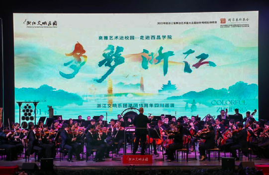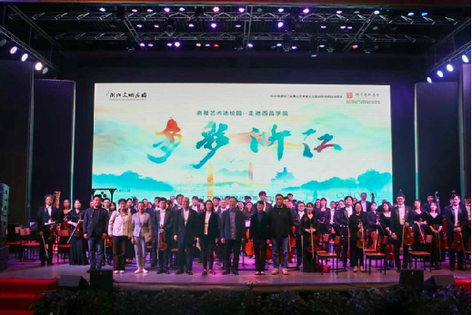 艺术滋养灵魂,音乐传递真情。为落实中共中央办公厅、国务院办公厅印发的《关于全面加强和改进新时代学校美育工作的意见》要求,深入推进高雅艺术进校园活动,丰富校园文化生活,以艺润心、以艺启智、以艺育人,引导青年学生涵养进取品格,厚植家国情怀。11 月 1日晚19:00,高雅艺术进校园——“多彩浙江”浙江交响乐团建团 15 周年四川巡演走进西昌学院专场音乐会在西昌学院安宁校区学生活动中心举行。浙江交响乐团书记、团长郭义江,副团长王楠楠以及学校有关部门和二级学院党委负责同志、各二级学院分团委负责同志,教师代表以及学生代表共同观看此次演出,共赴这一场心灵与艺术的浪漫邂逅。