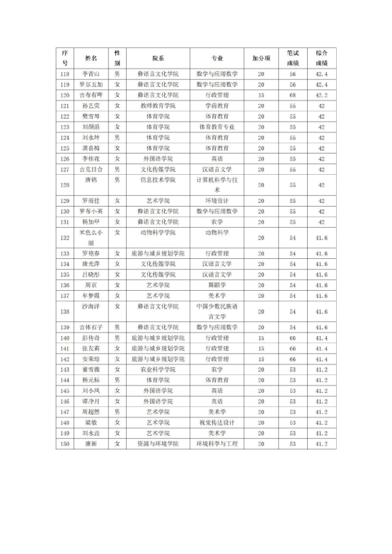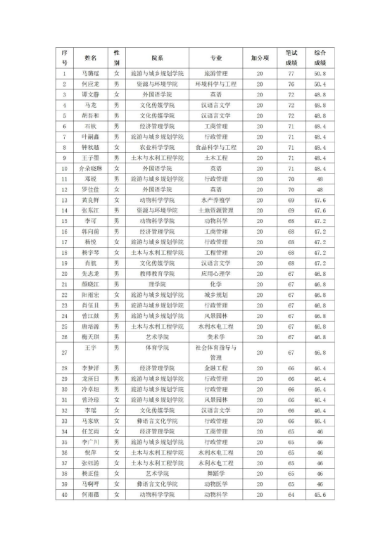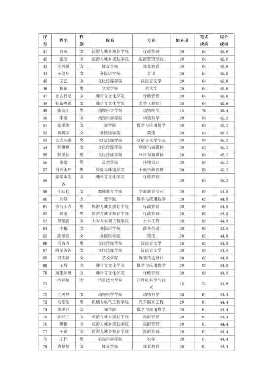根据四川省大学生志愿服务西部计划项目管理办公室《关于2023年四川省大学生志愿服务西部计划招募选拔相关工作安排的通知》(省目办发〔2023〕6号)文件要求,本次西昌学院大学生志愿服务西部计划志愿者招募考试应参加考试人数392人,实际参加考试人数338人,经研究决定,按照《关于2023年四川省大学生志愿服务西部计划招募选拔相关工作安排的通知》中明确的进入面试人数比例(即最终招募指标的3倍以上),根据加分项与笔试成绩之和确定前150名进入2023年西昌学院大学生志愿服务西部计划志愿者招募考试面试阶段,现将积分项、笔试成绩(按40%折算)及进入面试考生名单公布如下:     公示期为2023年5月29日-5月31日,如有任何异议,请在公示期间以书面形式或电话形式反映。 联系人:董华芳 联系电话:0834-2580080 邮箱:xcctw-tsjy@163.com 面试须知 一、面试时间:6月1日下午14:30-16:30 二、面试地点:安宁校区博远楼(第八教学楼) 三、注意事项:请考生带上身份证于6月1日14:00前在安宁校区博远楼报到。 |