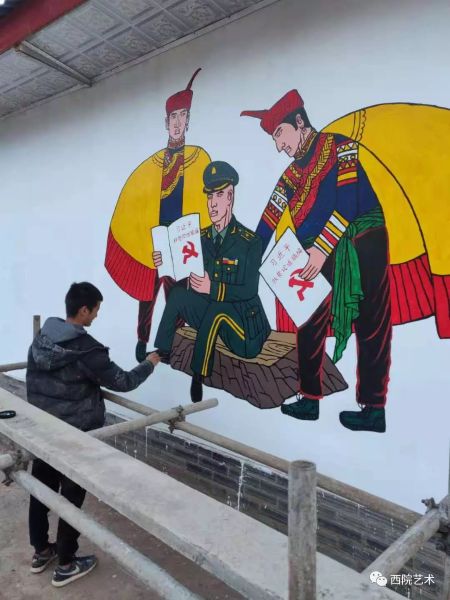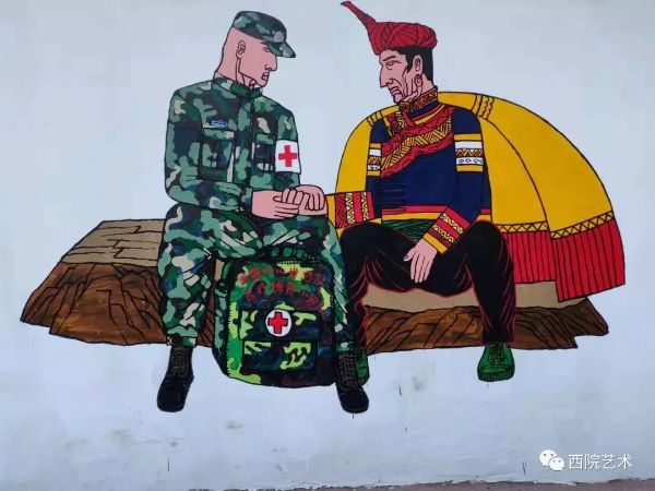 活动中虽然只有师生两人,但是仍以集体为单位进行创作,共同绘制墙面。山区乡村阴冷潮湿、气候恶劣、工具简陋,给壁画绘制带来了不便,但这并没有难到志愿者们。为了争取绘制时间,志愿者们既分工又合作,以饱满的热情、以为精准扶贫风险的精神,克服各种困难,精心绘制壁画。在整个工程设计中,志愿者们把“军民一家亲”作为整个任务的绘制主题,万江老师采用村民们喜闻乐见的图文形式设计创作,其色彩之鲜艳,构图之和谐,想象力之丰富,令人感到惊喜,同时凸显了军民之间互帮互助的氛围,传递出爱党爱国爱家的正能量。
