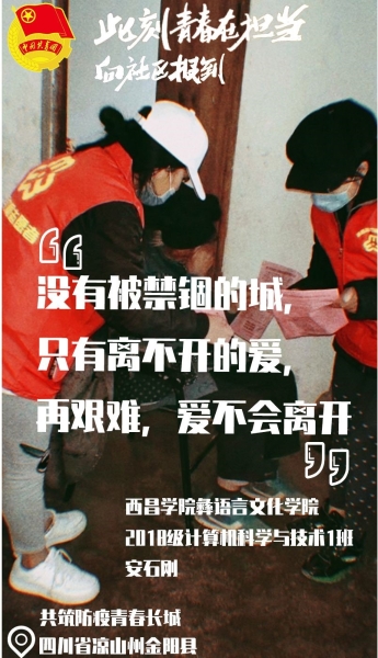 疫情肆意生长, 等待春天的时光好像无比的漫长。 但这个冬天并不寒冷, 因为有一颗颗热切的心在抗疫前线奋斗, 有一群群热情的人在远方支援。 西院志愿者亦挺身而出, 奉献出自己的一份爱心! 疫情阻断了交通,但阻断不了爱。俗说患难见真情,这一次,让我们一起来感受爱的力量与温度吧! 教师教育学院 疫情面前没有旁观者,疫情防控没有局外人。      信息技术学院 齐心协力抗疫情,愿一切都向好的方向转变!      彝语言学院 做“守护者”,就是要担使命、保安康。    机械与电子工程学院 隔离病毒,但不隔离爱,因为爱是桥梁。    这些爱,足以温暖这一整个冬天。当全民同心战疫情时,春天也一定会更加明媚的到来。 让我们心相连、情相拥、爱相通, 众志成城克时艰, 勤力同心战疫情。 于寒冬深处, 守一轮云开月明, 候一片春暖花开, 等一场期盼已久的相逢! 向最美志愿者们致敬! |