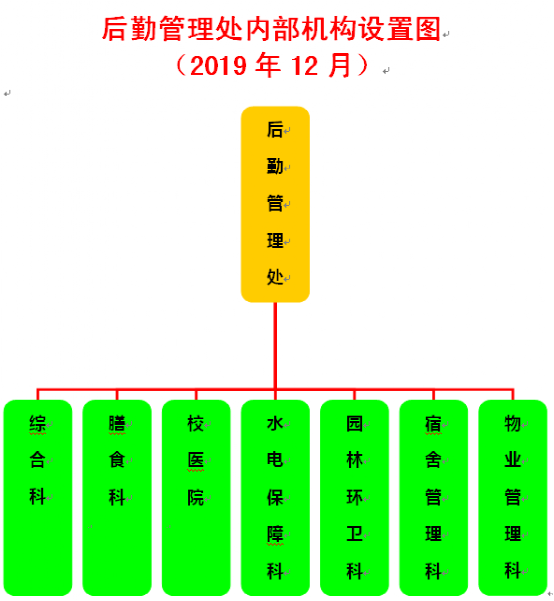 后勤管理处是学校后勤管理服务职能部门,主要负责水电保障、餐饮服务、园林绿化、医疗保健、宿舍管理、物业管理、车辆管理等服务和保障工作。在全面履行部门工作职能中,以创建“高效后勤、和谐后勤、满意后勤”为工作目标,秉承“团结、敬业、务实、高效”的文化精神,按照“服务优质、管理规范、安全稳定、保障有力”的工作标准,以“勇于担当的责任意识、甘于付出的奉献精神、不怕吃苦的工作态度”,为学校发展做出应有贡献。