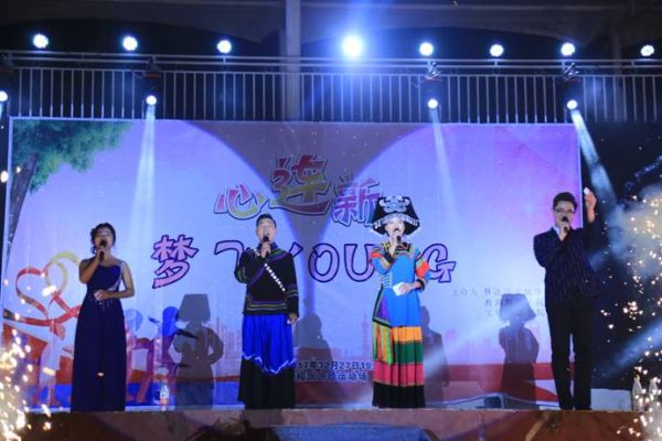 2017年12月27日晚18:30,由文化传媒学院,教师教育学院,彝语言文化学院联合主办的“心连新,梦飞YOUNG”跨年晚会在操场举行。