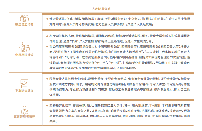 顺丰重视员工职业发展,基于“竞争、激励、淘汰”用人理念, 落实“双价”用人标准,促进符合价值观要求、具备使命感、持续优秀的人才浮出并发展。 公司在《人才管理制度》中,明确规定了晋升原则和不同类别员工的晋升要求,强调人岗匹配和价值贡献。对于价值贡献突出的员工给予更多发展机会,并将学习、激励等资源进行倾斜。 2022年,公司持续完善管理和专业发展双通道成长机制,为员工提供良好的发展平台:通过管理发展通道,让具备一定管理能力的员工参与企业运营管理;通过专业发展通道,让技术类员工通过不断提升个人技能,积累专业经验,成为各领域专家。
