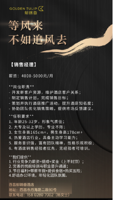 岗位职责:开发新客户资源,维护酒店客户关系;制定销售计划,完成销售目标;策划并执行酒店推广活动,提升酒店知名度:协助团队优化销售策略,提供市场反馈建议。