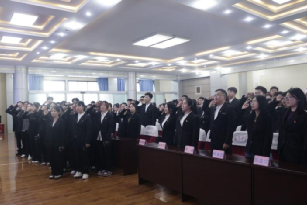 仪式在庄严的国歌声中拉开帷幕,全体人员肃立,齐声高唱国歌,激昂的旋律回荡在会场,瞬间点燃每一个人心中的爱国热情。工作人员宣读新团员名单,老团员代表们怀着庄重的心情,为新团员佩戴上象征着荣誉与责任的团徽。在鲜艳的团旗下,新团员们右手握拳,庄严宣誓:“我志愿加入中国共产主义青年团,坚决拥护中国共产党的领导……”铿锵有力的誓言,表达了他们对共青团组织的无限忠诚和为共产主义事业奋斗终身的坚定决心。