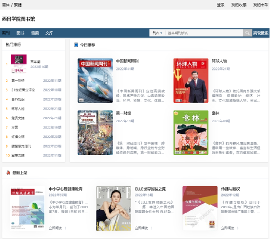 龙源精品人文电子期刊阅览室使用方法 【资源介绍】  《龙源精品人文电子期刊阅览室》是由龙源期刊网根据我佼的特点和需求,专门定制而成的大型人文类期刊阅读平台,涵盖了中国3000多种主流的精品人文期刊,内容涵盖了时政新闻、科技科普、经济法律、管理财经、社科历史、文学文摘、健康生活、文化艺术、教育学习等九个大类,以整刊、现刊的网络方式呈现,读者可以通过电脑、手机或手持阅读器直接访问,使用方便快捷。 【资源特色】 1、人文特色浓厚,突出大刊、名刊 :《读者》、《意林》、《百科知识》、《家庭》、《百年潮》、《商界》、《财经》、《新民周刊》、《南风窗》、《电脑爱好者》、《新兵器》…… 2、完善的版权解决方案,以保证读者能够持续,长期的进行阅读。 3、与印刷版期刊实现同步出版、同步更新。 4、使用方便,不需下载任何阅读器即可全文阅读。 5、期刊实行整刊版、原文原貌版、语音版、专题版的多版本立体阅读,更加符合广大读者的阅读习惯。 【使用方法】 1、电脑端访问方法: 本校专用通道:https://xcxywx.dps.qikan.cn/pc2 龙源多听音频阅览室:https://xcxywx.dps.qikan.cn/dt (温馨提示:校外使用务必通过以上链接点击进入阅读平台,直接复制地址到浏览器上不可使用) 2、移动端阅读方法: “龙源微信期刊阅览室”能够以菜单的形式置入到微信公众号,为广大微信读者提供移动在线阅读服务,大家可以用微信扫码进入平台,随时随地方便阅读。  3、大屏端阅读方法: 龙源电子书刊借阅机,位置图书馆一楼大厅,集成了电子图书和电子期刊的在线阅读和下载到手机离线阅读的功能。包含了时政新闻、播放视频、查阅报纸 ,提供期刊、图书、音频等资源,搭配和呈现方式上更加的灵活自如,大家可前往阅读体验。 |