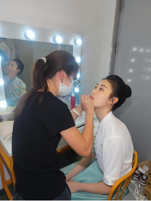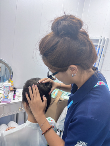 张一萍、贺骏和刘丹同学主要投身于礼仪妆造工作,为赛事形象增光添彩。张一萍同学在射箭项目负责礼仪人员的服装熨烫,确保礼仪以最佳风貌登场,同时她也参与了舞台监督的工作。贺骏同学为体操、啦啦操项目的礼仪们打造了色彩明快的妆容,与运动员的活力风格相得益彰。刘丹同学则根据室内荷球项目的特点,为礼仪人员设计了持久且得体的妆容,保证了她们在长时间服务中始终保持良好形象。