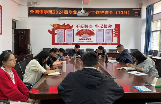 为提高我院学生就业质量,确保2024届毕业生就业工作稳步开展,2023年10月25日,外国语学院在弘毅楼会议室召开了2024届毕业生就业工作推进会。外国语学院党委书记文宇、院长陈红梅、副院长陈怀志以及学生科、教务科负责人和毕业班辅导员参加了会议。