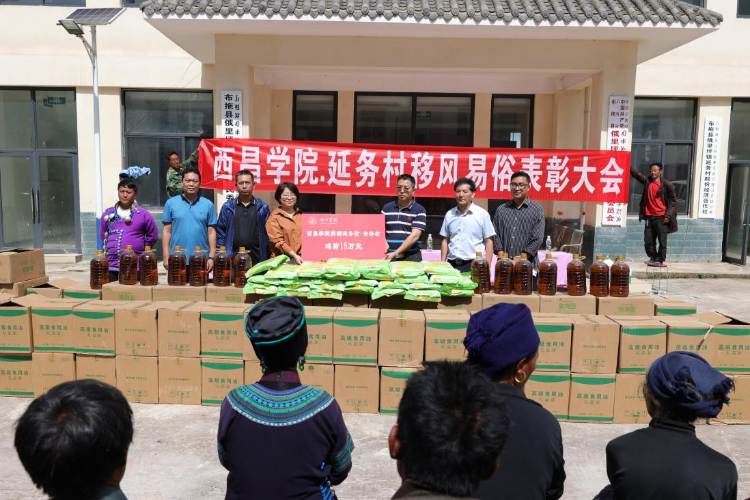 白洁为合洛村、延务村移风易俗先进个人颁发了奖品,并将学校今年实施的高山鸡养殖、饲草种植帮扶项目资金25万元,捐赠给了合洛村、延务村。白洁指出,帮扶布拖县俄里坪镇是凉山州委、州政府交予我们的光荣任务,学校一定倾力尽心完成。在帮扶过程中,虚心听取镇党委、政府、村两委和广大村民的意见、建议,让定点帮扶工作取得实效,真正让群众满意。