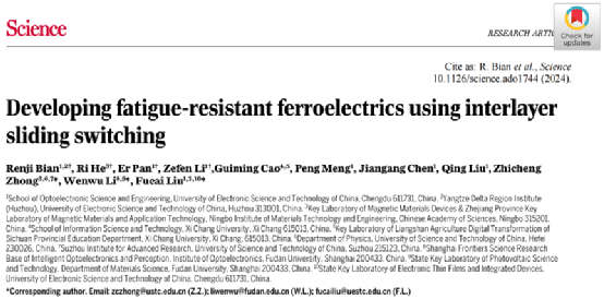 近日,西昌学院信息技术学院曹桂铭副教授在国家自然科学基金项目(62304183)支持下,与电子科技大学光电科学与工程学院刘富才教授团队合作,作为主要合作者之一,在全球顶级学术期刊《Science》于6月7日以 First Release 形式,在线发表了题为“Developing fatigue-resistant ferroelectrics using interlayer sliding switching”最新研究成果。