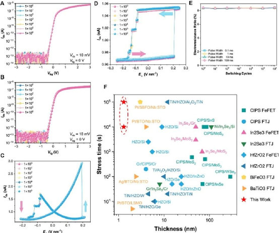 针对传统铁电疲劳特性问题,研究团队发现了一种具有超强耐疲劳特性的新型铁电体-范德华层状滑移铁电。不同于传统铁电极化的离子位移机制,滑移铁电体在电场的作用下,范德华层状材料的层与层之间产生整体滑移,同时层间发生电荷转移,进而实现面外极化翻转(图1B)。滑移铁电器件在经历高达400万次的循环电场极化翻转后,铁电极化并没有发生任何衰减,呈现出优异的抗疲劳特性(图2)。跨尺度原子模拟计算表明,层间滑移过程并不会导致带电缺陷迁移和聚集,由此免于铁电疲劳。理论上,滑移铁电存储器有望实现无限次读写操作。该项研究成果为解决铁电材料在非易失性存储器、存算一体器件及类脑计算芯片等新颖器件中的应用,提供了一种具有竞争潜力的解决方案。
