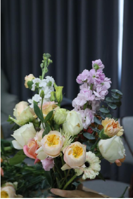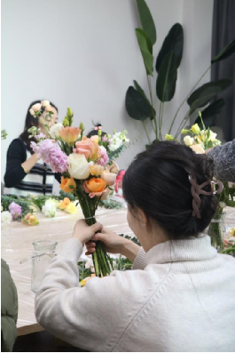 活动中,花艺协会会长详细讲解如何利用简单的花材和包装做出赏心愉目的花束以及花瓶插花的花材选择、色彩搭配、造型设计等基本知识和技巧。老师们精选了当季最新鲜的花卉搭配着最美的花艺造型,每一朵都承载着自然的馈赠,白的玫瑰、橙的康乃馨、彩色的洋桔梗……