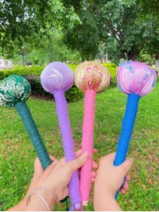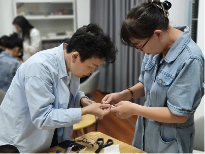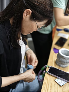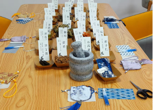 在香包制作环节,每位老师先是了解了常见香料(如艾叶、藿香、佩兰等)的功效和用途,随后亲手挑选自己喜欢的香料,搭配出独一无二的香包,并亲手缝制、填充香料,最后进行装饰。在艾草养生锤制作环节,老师们学习了艾草的养生功效,并制作出实用的养生锤。