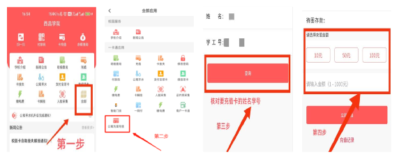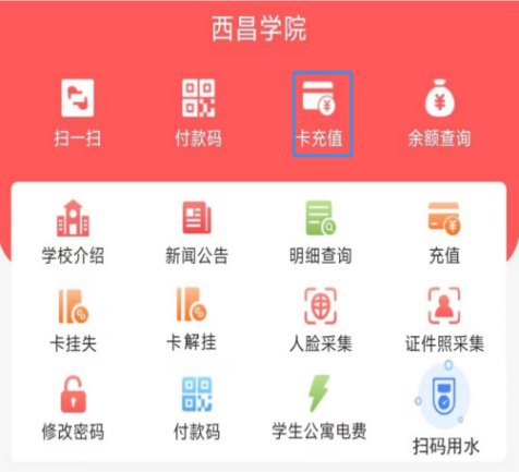 打开易校园APP,在首页页面选择【卡充值】,输入充值金额,点【充值】,选择支付方式后,点【立即支付】,完成充值。