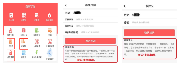 1.点击【卡挂失】,需要输入交易密码,挂失后卡片无法再进行消费交易,如卡片找回可点击【卡解挂】输入交易密码自主解挂,解挂后卡片恢复交易。初始密码为身份证号后六位(原系统未录入证件号的师生初始密码为学工号后六位),字母用0代替。