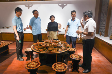 彝族文化研究中心主任沙马打各向考察组一行介绍了研究中心的基本情况,并对中心彝族漆器文化、支格阿鲁文化、彝文书法和彝族服饰四个展厅的展品作了细致生动地讲解。