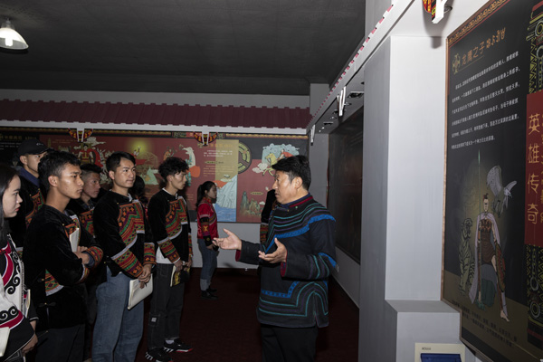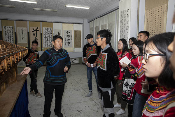 彝文书法展厅向学生讲解传统民居模型