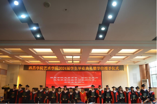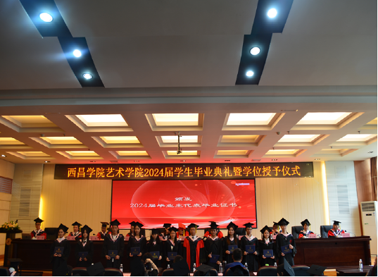 在毕业典礼暨学位授予仪式上,艺术学院院长叶峰同志宣读了2024届本科毕业生授位决定;艺术学院党委副书记(主持工作)柳霞同志宣读了2024届省级、校级优秀大学毕业生表彰决定及考上研究生学生名单。西昌学院党委委员、副校长张炜同志、艺术学院学术委员会委员与导师代表依次为2024届毕业生颁发获奖证书、毕业证书和学位证书。
