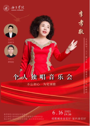 2025年6月16日,艺术学院博士教师李孝敬在成都城市音乐厅成功举办“不忘初心 为党颂歌”个人独唱音乐会,本场音乐会由四川省音乐家协会全程指导,四川省音乐家协会钢琴艺术指导学会主办,西昌学院艺术学院和凉山州音乐家协会协办。