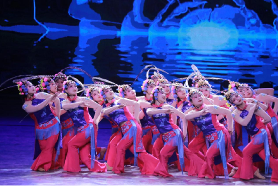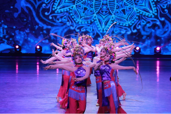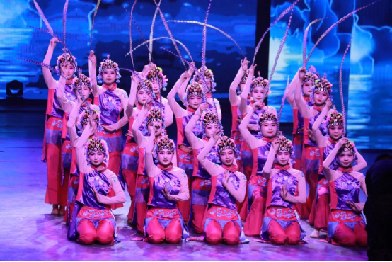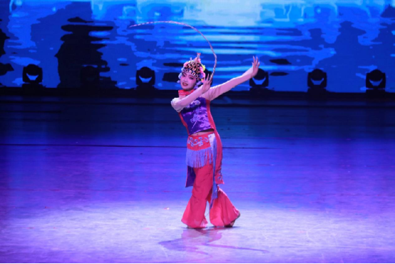 《粉墨春秋》一舞,巧妙融合戏曲艺术精髓与舞蹈创意。当大幕拉开,资环学院的舞者们化身戏曲传承的使者,水袖翩跹间,戏曲的程式化动作被赋予新的生命力。舞台灯光流转,从暖黄的“戏台光晕”到冷白的“时空切换”,舞者们在光影变幻中,将戏曲艺术的传承脉络清晰呈现。他们或疾步辗转,模拟戏曲舞台上的跌打翻滚;或轻抬眉眼,传递戏曲人物的细腻情思。每一次水袖扬起,都是对传统艺术的深情诉说;每一步精准步伐,都饱含着对文化传承的执着。